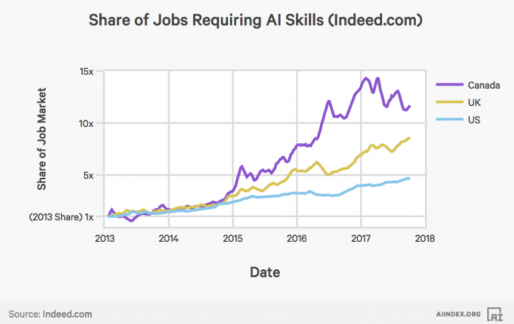 AI talent is increasingly in demand because of many companies are looking to integrate the tech. The share of jobs in Canada that require AI skills has grown 1069 per cent since January 2013, which represents a faster growth rate than both the U.K and U.S., as shown below.